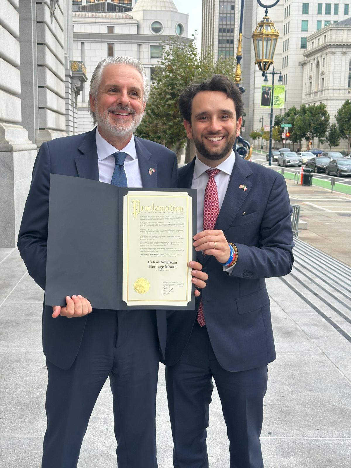 Consul General Carnelos expressed his appreciation to the Mayor’s Office, the Office of Protocol, the Assemblymembers, and the Board of Supervisors for their ongoing recognition and support of Italian traditions and heritage. He also optimistically anticipated the extraordinary momentum of Italian innovation across the Bay Area, propelled by institutions such as the Italian Innovation and Culture Hub – INNOVIT. He also announced the Italian Parliament’s declaration of October 4th as a national holiday in honor of Italy’s Patron Saint, San Francis of Assisi, after whom the city of San Francisco is named.